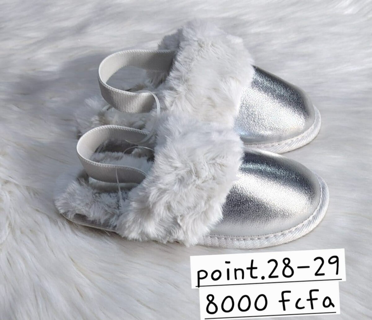 Sandales argentées pour filles avec fourrure douce. Pointures 28-29, parfaites pour un look élégant et confortable. Idéales pour l'été et les occasions spéciales.