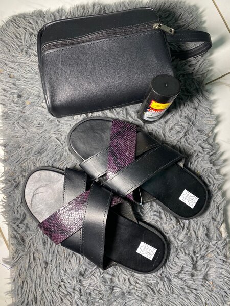 Sandales en cuir noire avec La semelle noire, la large bride sur le dessus du pied est également noire. Sandales uniquement 8.000f et sandales +trousse+cirage = 16.000f
