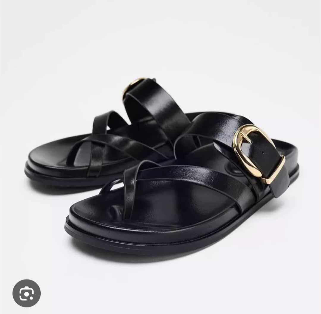 Élégantes sandales en cuir noir avec des boucles dorées. Parfaites pour un look chic et décontracté cet été. Idéales pour les sorties en ville et les occasions spéciales.