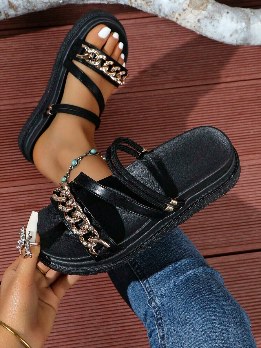 Optez pour ces sandales noires élégantes agrémentées de chaînes dorées. Parfaites pour un look chic et décontracté cet été. Associez-les facilement avec vos tenues préférées.