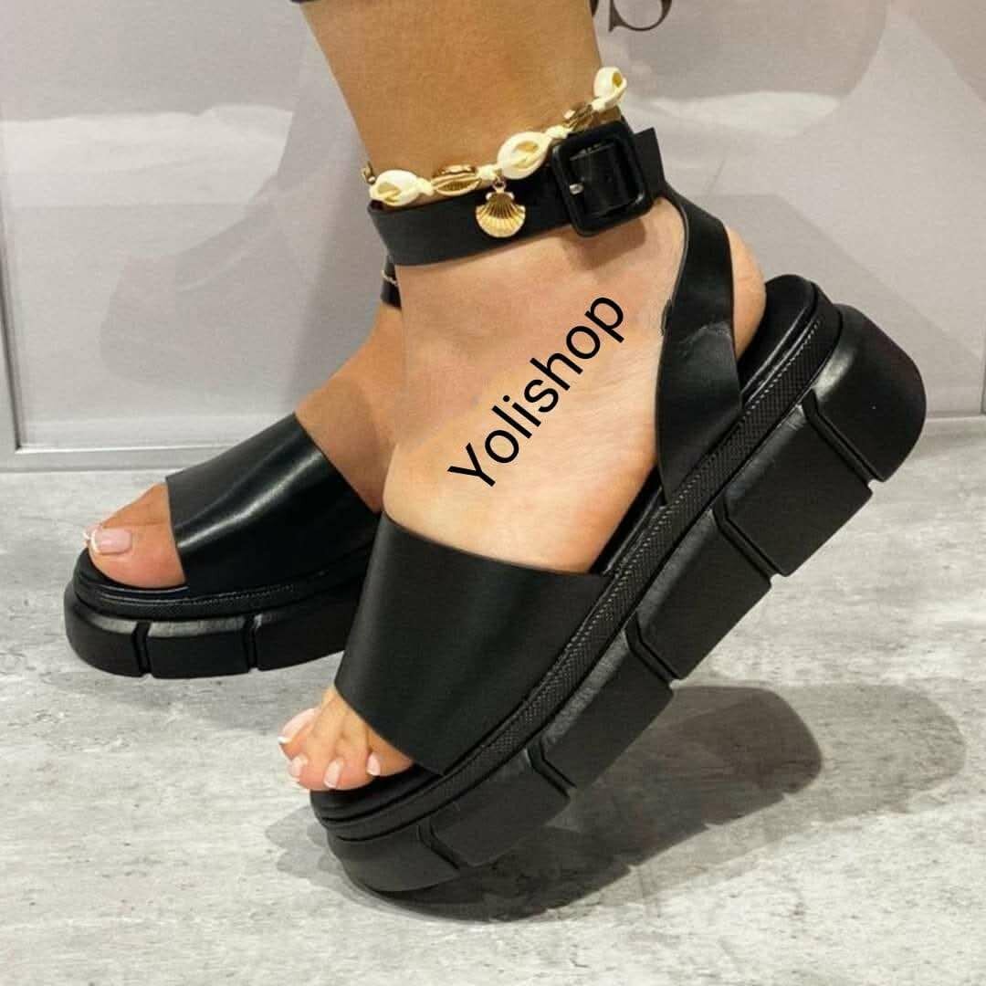 Élégantes sandales noires pour femme avec semelle épaisse, idéales pour un look moderne et confortable. Parfaites pour les sorties estivales et les tenues décontractées.