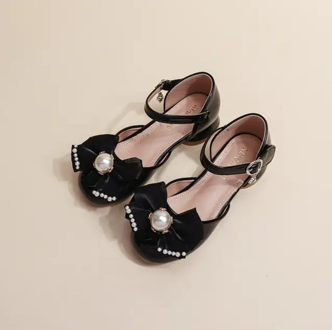 Élégantes sandales noires pour enfant, ornées de perles et nœud, parfaites pour occasions spéciales. Confortables et stylées.