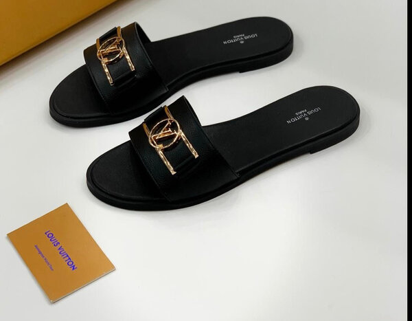 Sandales noires logo doré, style chic avec semelle plate. Parfait pour un look élégant en toute simplicité. Produit neuf.