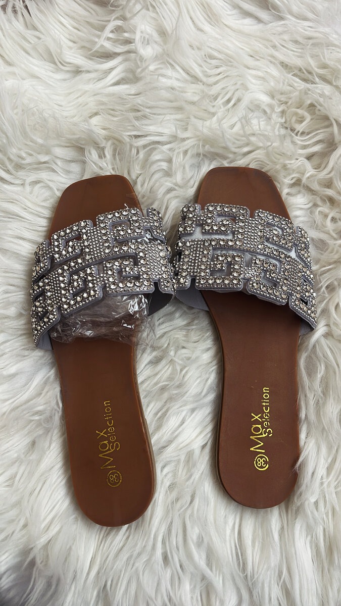 Élégantes sandales plates en strass pour femme. Confortables et idéales pour l'été, elles ajoutent une touche de glamour à votre tenue.