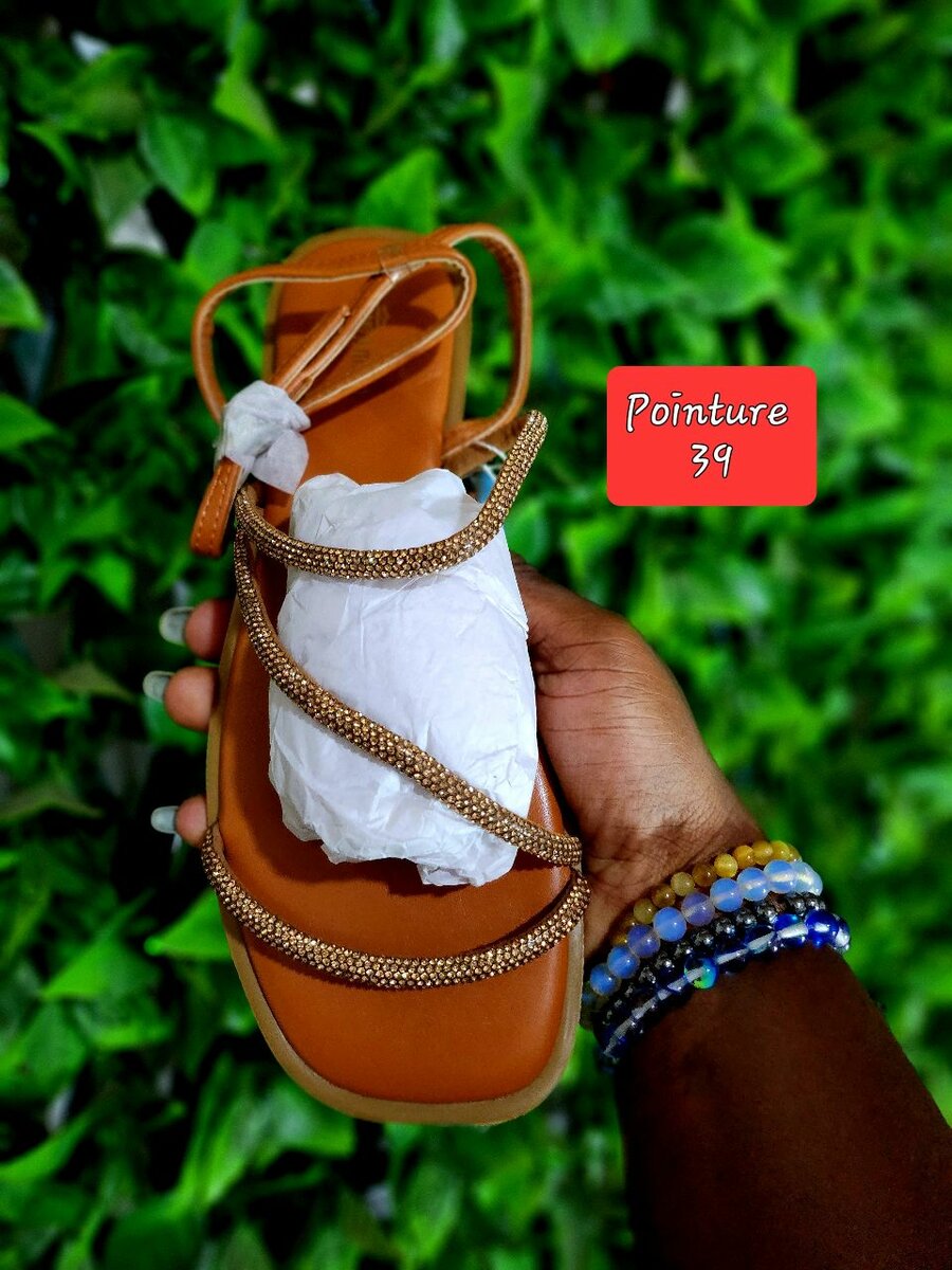 Sandales plates en cuir marron avec des lanières dorées. Confortables et élégantes, idéales pour l'été. Pointure 39 disponible.