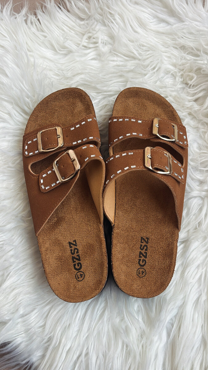 Sandales plates en cuir marron avec deux sangles à boucle, idéales pour l'été. Confortables et élégantes, elles sont parfaites pour les promenades ou les sorties décontractées.