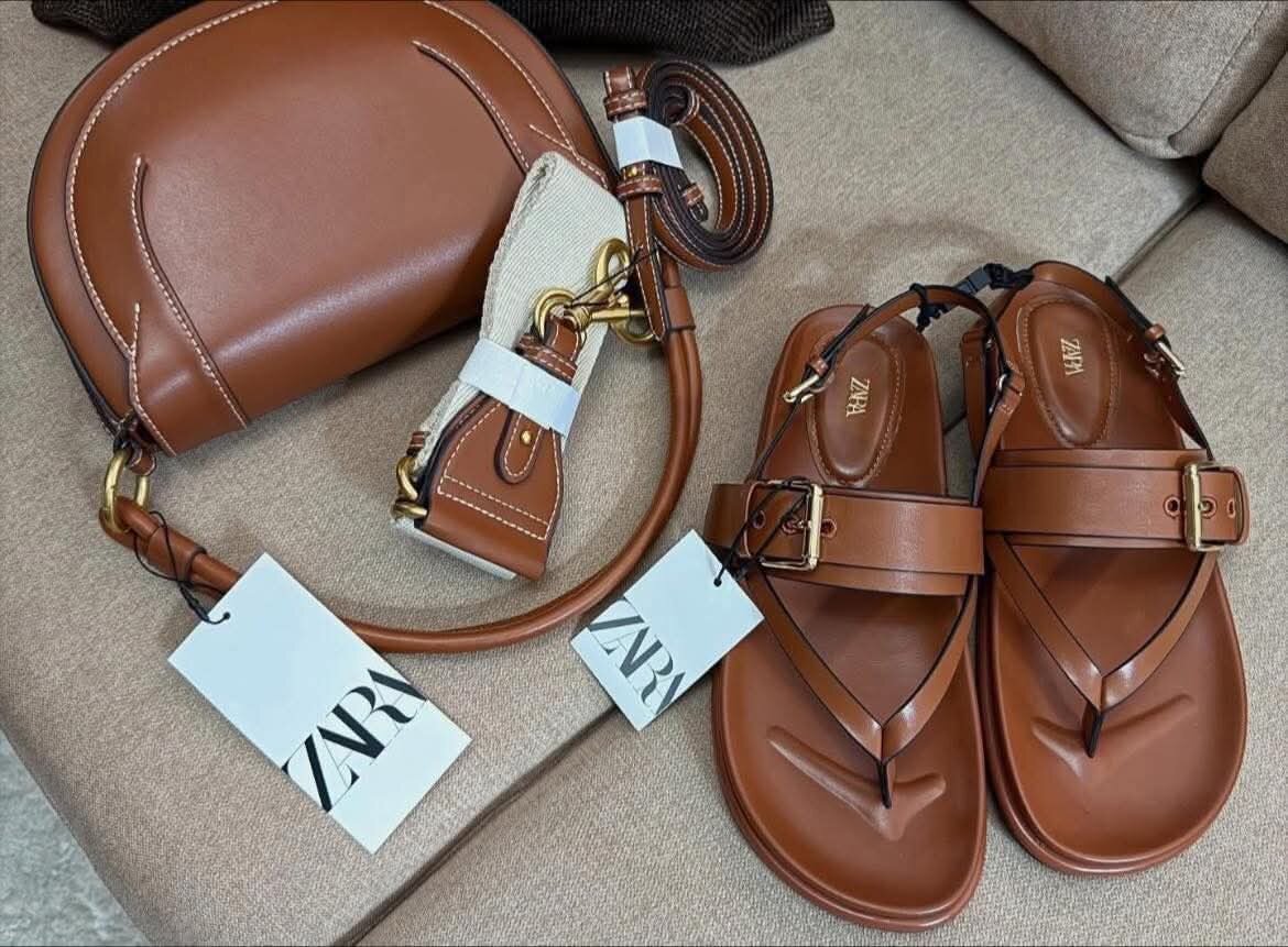 Découvrez les sandales plates en cuir marron de ZARA, parfaites pour une tenue décontractée. Conçues pour le confort, ces sandales sont idéales pour les journées ensoleillées. Associées à un sac à main assorti pour un look élégant.