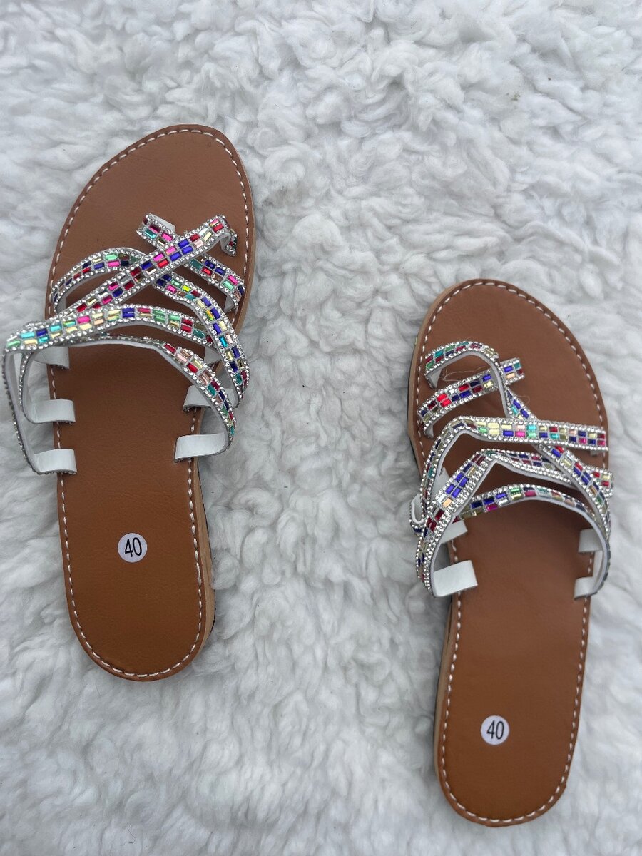 Élégantes sandales plates pour femme avec décor de strass colorés. Idéales pour une tenue estivale chic et confortable. Taille 40.