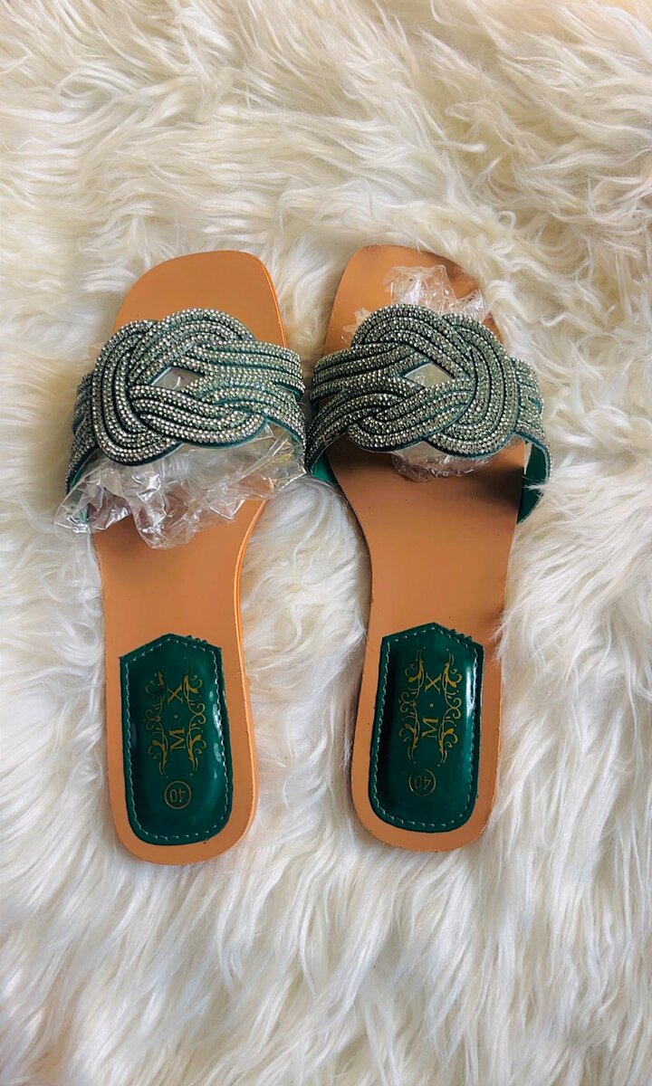 Élégantes sandales plates vertes en cuir avec des détails en strass. Conçues pour un confort optimal, elles sont idéales pour les journées ensoleillées. Semelle en cuir, dessus orné de strass.