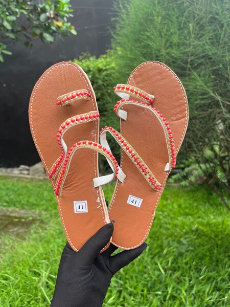 Découvrez le confort et le style des sandales en cuir avec broderie rayée rouge et or. Elles sont parfaites pour les sorties estivales ou une promenade en ville. Fabriquées pour offrir une tenue confortable, ces sandales sont idéales pour les journées chaudes. Taille disponible: 38.