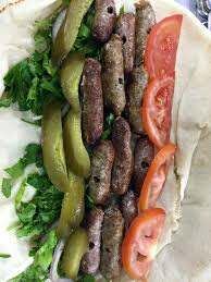 Viande hachée assaisonnée, grillée et servie avec tahini et légumes frais.