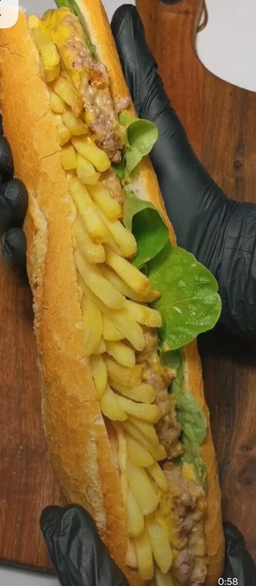 Pain de boulangerie, œufs, poulet émietté, fromage, frites, légumes, laitue, sauce burger, ketchup