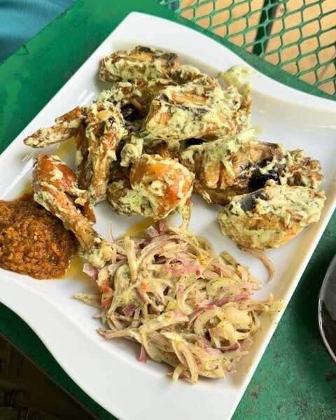 Savourez notre succulent crabe en sauce épicée, accompagné de boulettes de banane salées. Parfait pour un repas exotique et savoureux. Idéal pour les amateurs de fruits de mer!