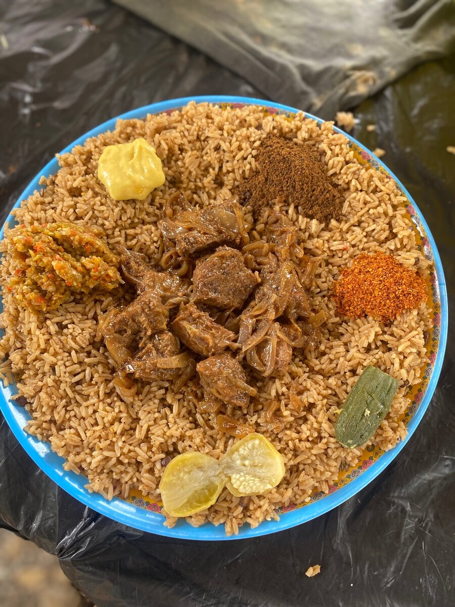 Découvrez un plat exquis de riz épicé avec des morceaux tendres de viande, accompagné d'une sélection colorée de garnitures. Parfait pour les amateurs de cuisine épicée et savoureuse. Ce repas est idéal pour une expérience culinaire exotique chez vous ou lors d'une occasion spéciale. Régalez-vous avec un mélange équilibré de saveurs qui transporte vos papilles vers de nouveaux horizons. Essayez-le maintenant !