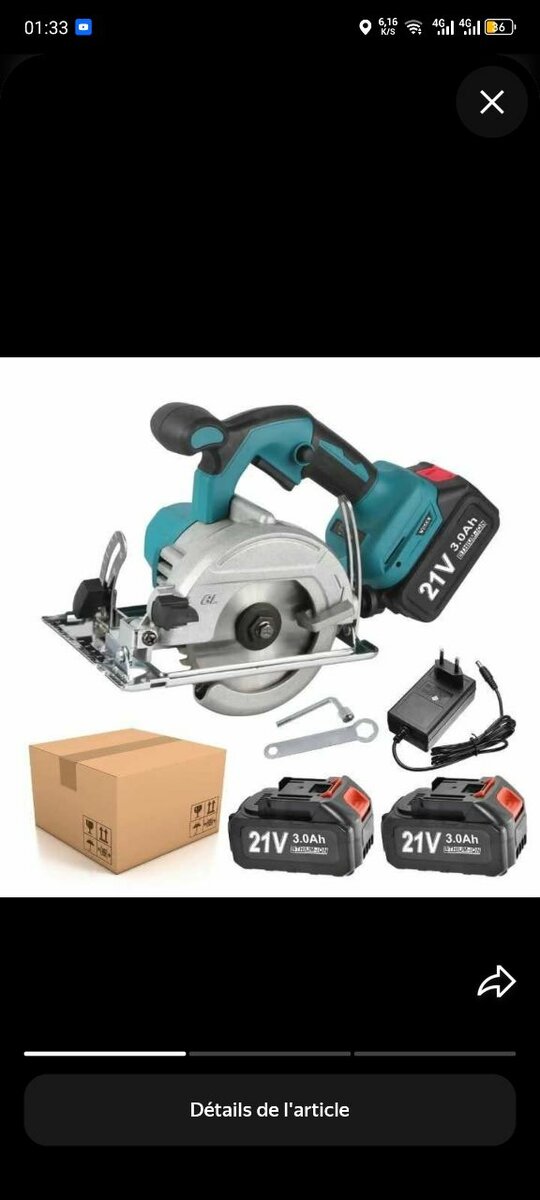 Découvrez notre scie circulaire sans fil 21V, parfaite pour vos projets de bricolage. Elle est livrée avec deux batteries rechargeables et un chargeur, garantissant une utilisation pratique et continue. Idéale pour couper du bois avec précision, elle est un outil indispensable pour les amateurs comme pour les professionnels. Commandez maintenant pour une expérience de découpe sans tracas!