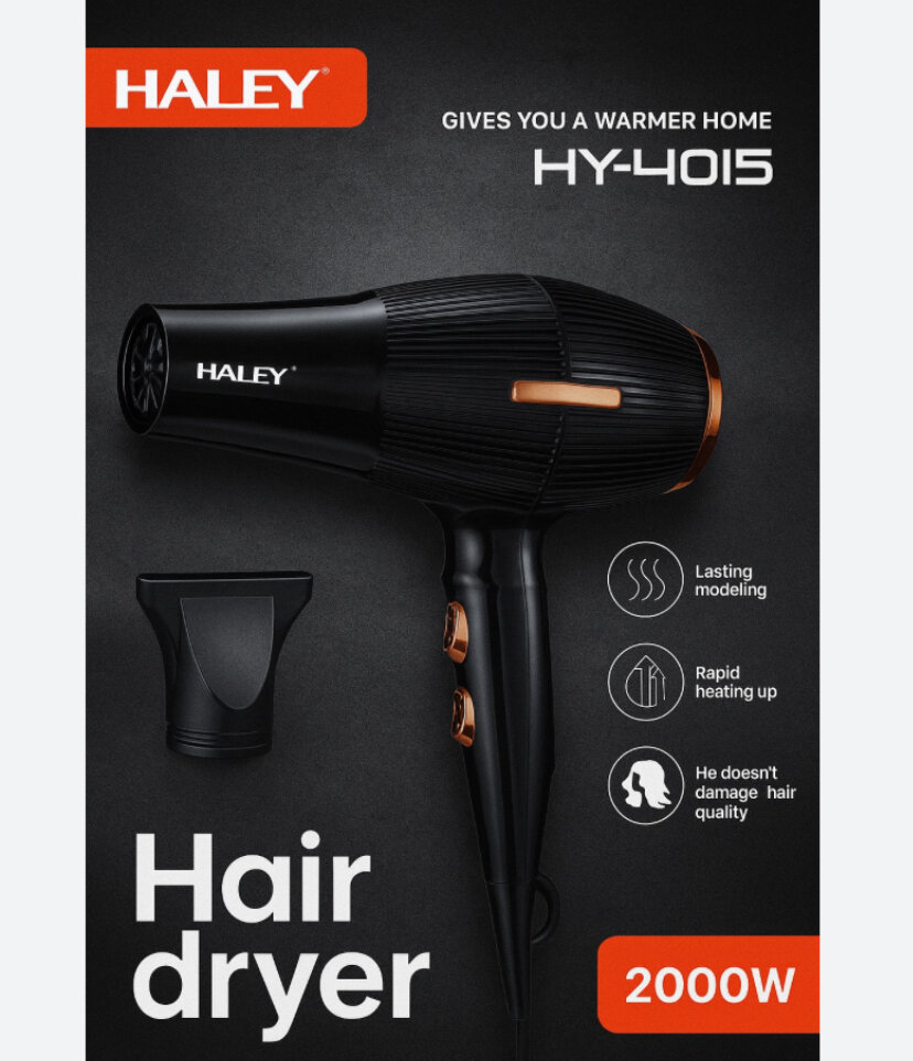 Découvrez le sèche-cheveux HALEY HY-4015, offrant un séchage rapide sans abîmer vos cheveux. Idéal pour un coiffage durable avec une chaleur rapide.