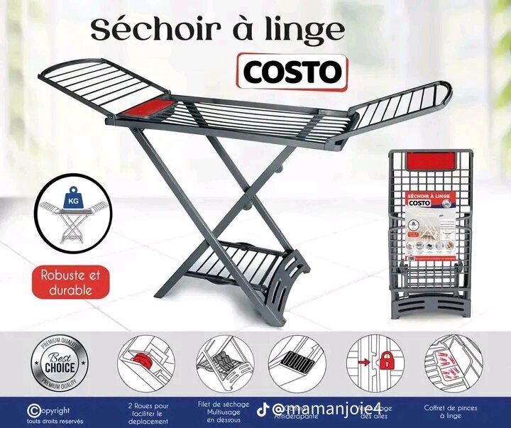 Séchoir à linge robuste et durable, idéal pour les grandes familles. Facile à déplacer grâce à ses roues. Son design compact le rend parfait pour tout intérieur.