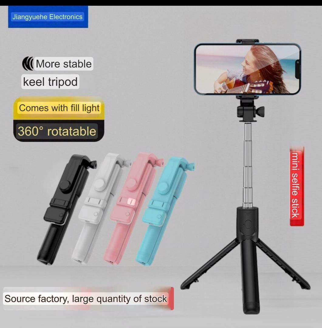 Can also be used as phone stand. Has a remote controller Bluetooth connection Mini light