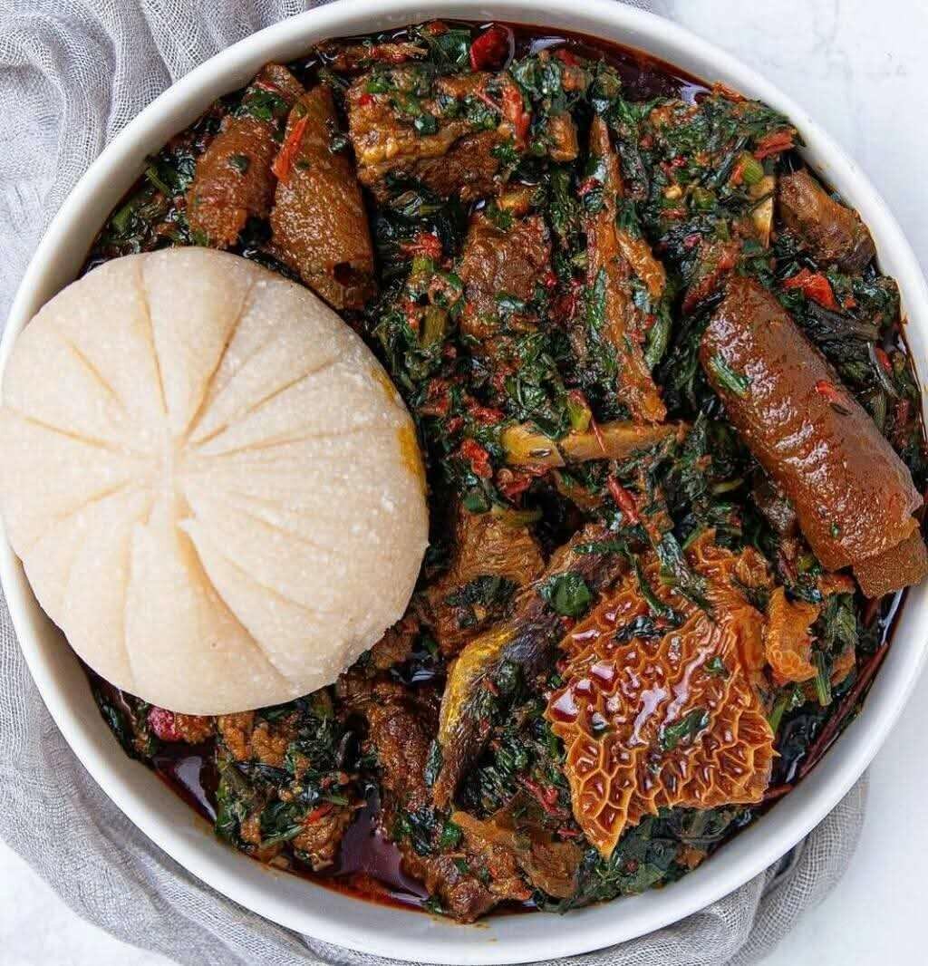 Experience a taste of Nigeria with this delicious traditional soup. Richly spiced, featuring assorted meats and leafy greens, it's perfect with pounded yam for a hearty meal.