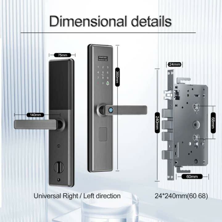 Serrure de porte intelligente avec clavier pour une sécurité à domicile renforcée. Étanche, antivol et facile à installer. Compatible avec direction droite/gauche. Dimensions: 240mm x 24mm. Serrure de haute qualité pour une protection optimale.
