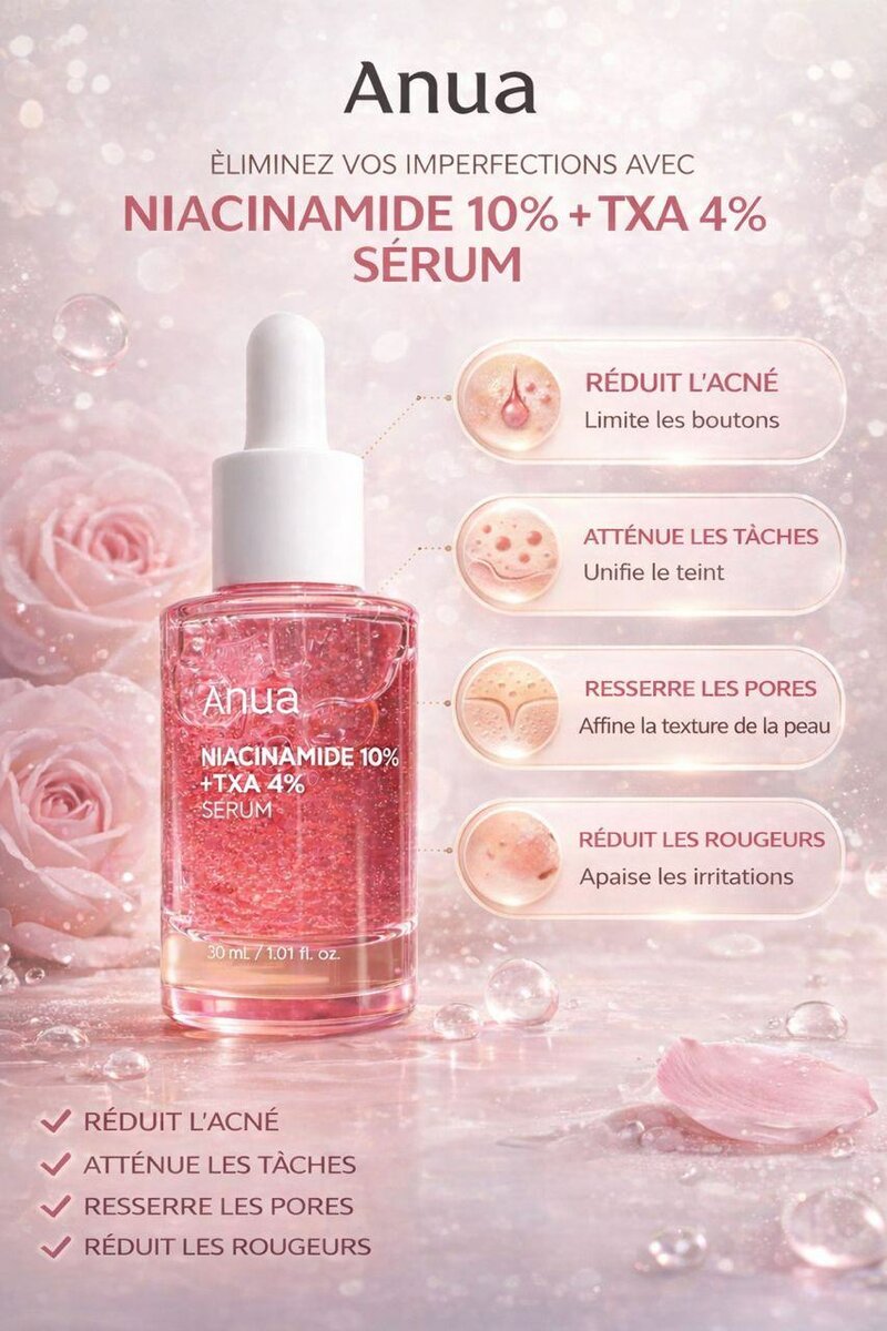 Éliminez les imperfections avec le Sérum Niacinamide 10% + TXA 4%. Idéal pour réduire l'acné, atténuer les taches, resserrer les pores et réduire les rougeurs. Offrez à votre peau une apparence uniforme et apaisée.