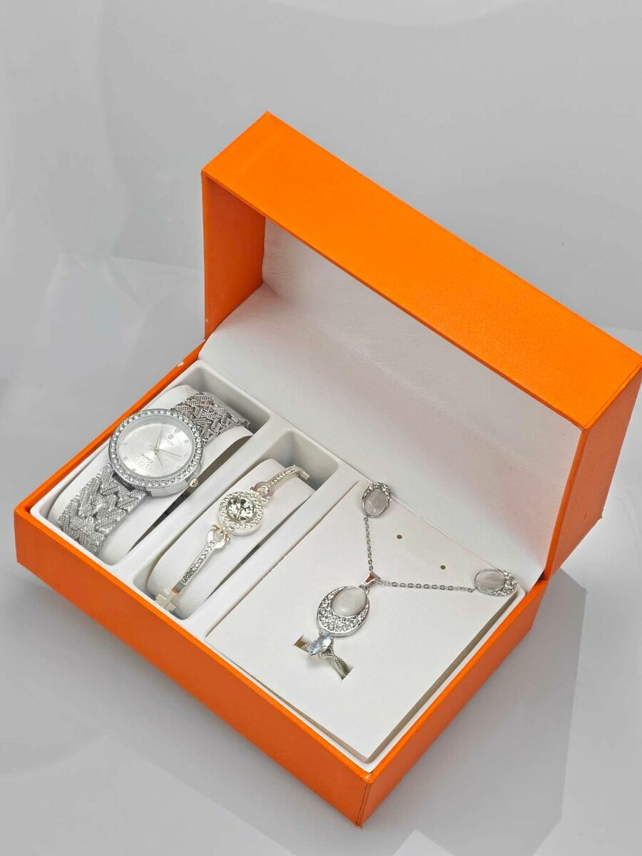 Complétez votre look avec cet ensemble de bijoux en argent élégant comprenant une montre scintillante, un bracelet raffiné, un collier et des boucles d'oreilles étincelantes. Parfait pour ajouter une touche de glamour à toute tenue ou pour offrir en cadeau.