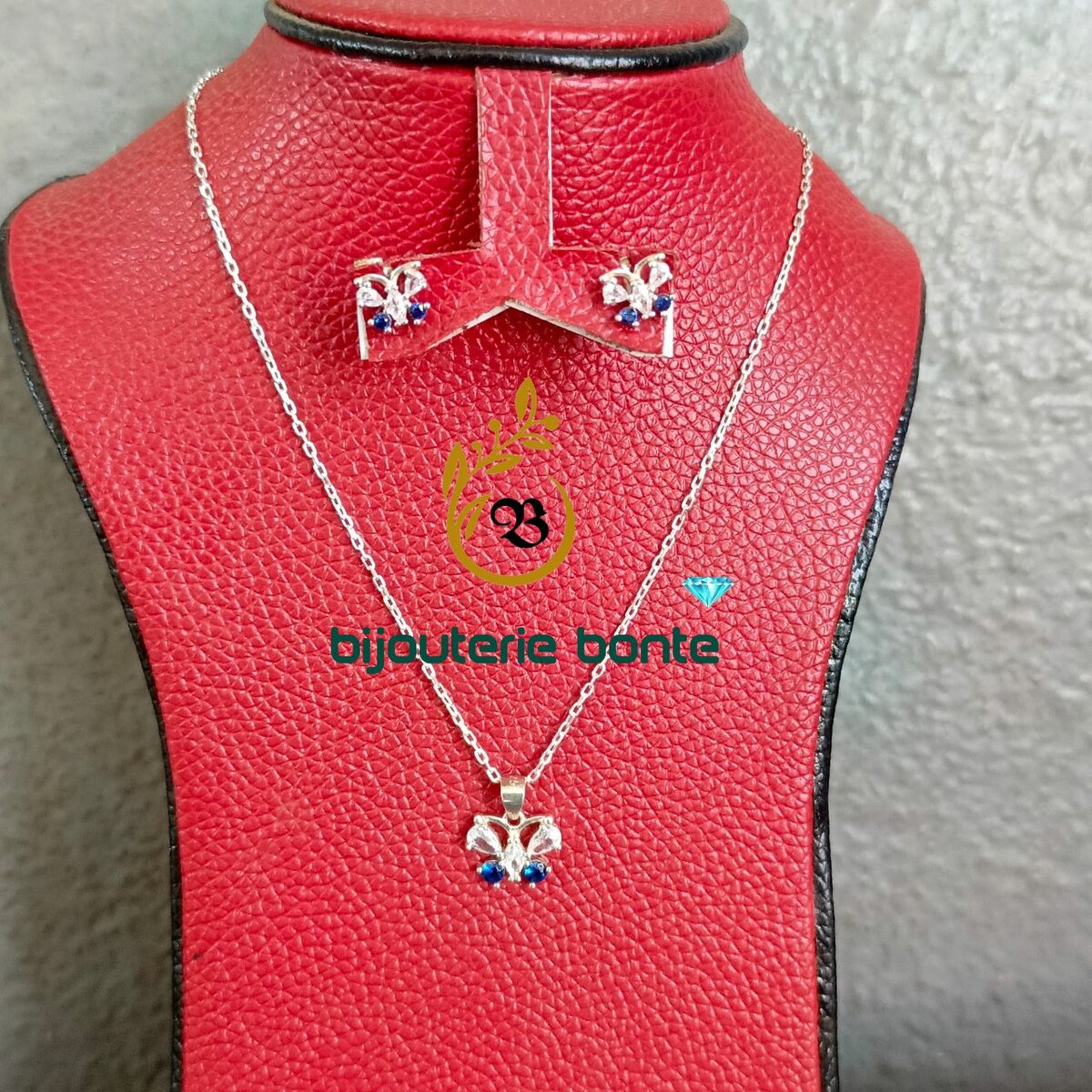 Ensemble élégant collier et boucles d'oreilles papillon en argent avec pierres bleues. Idéal pour une touche raffinée et moderne.