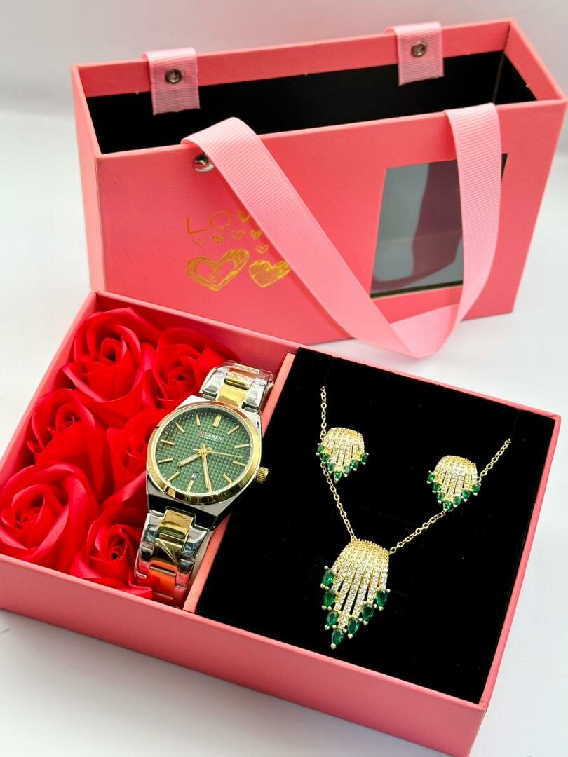 Élégant set cadeau comprenant une montre raffinée et un ensemble de bijoux étincelants. Disponible dans un coffret cadeau avec roses artificielles, idéal pour les occasions spéciales. Un cadeau parfait pour surprendre et ravir vos proches.