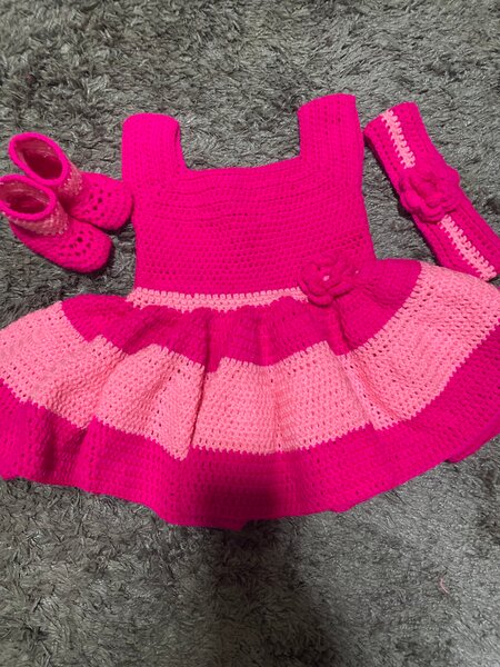 Ensemble crochet tendance en rose et violet, parfait pour une tenue décontractée ou spéciale. Composé d'une jupe élégante à volants et d'un haut à étoiles, cet ensemble est idéal pour les saisons fraîches. Fait main avec amour, il assure confort et style.
