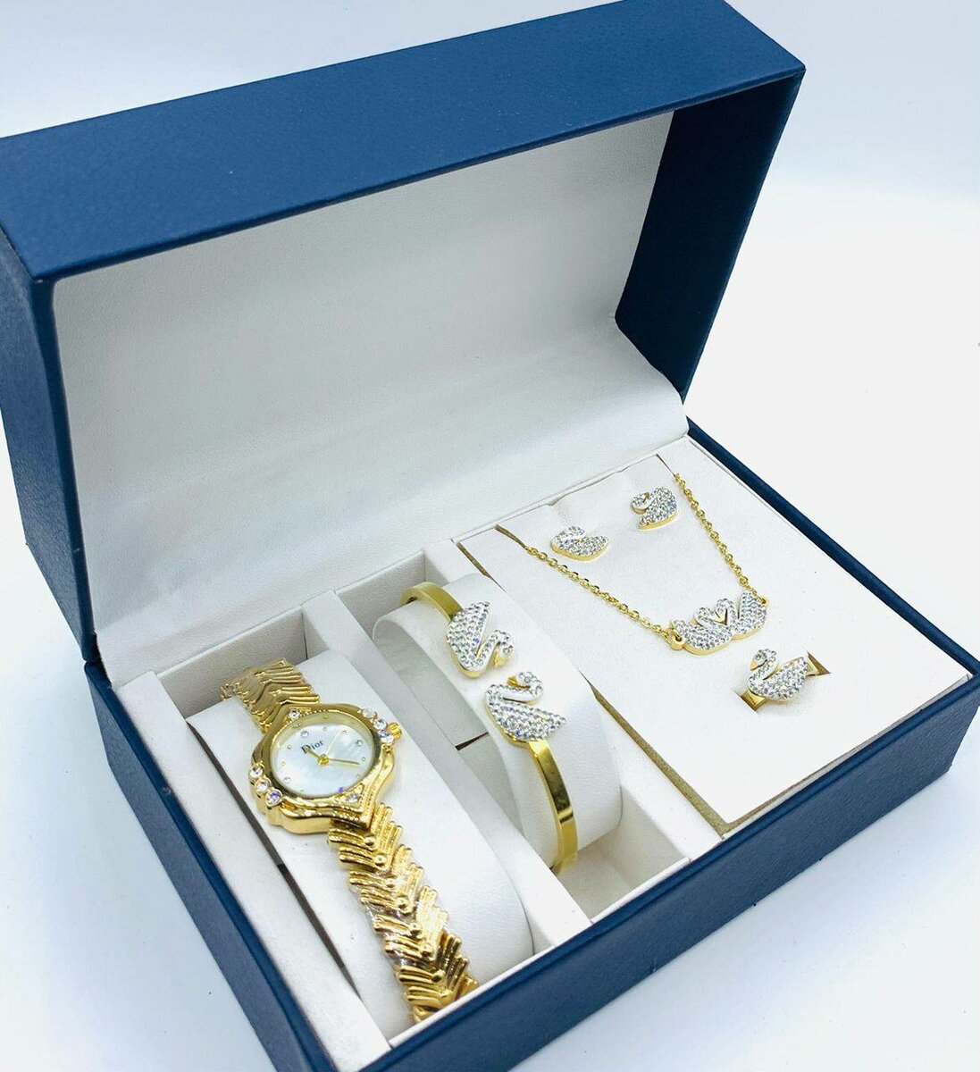 Découvrez notre ensemble de bijoux élégant comprenant un collier, des boucles d'oreilles, un bracelet et une montre assortie. Parfait pour compléter vos tenues de soirée ou offrir en cadeau. Fabriqué avec des matériaux de haute qualité pour une durabilité et un éclat exceptionnels. Idéal pour les occasions spéciales et les moments inoubliables.