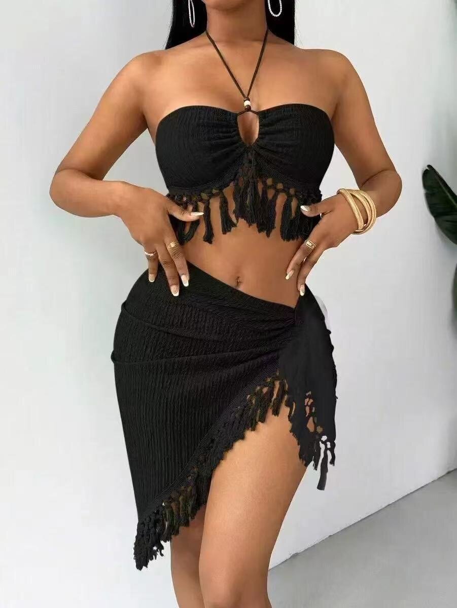 Découvrez ce set de bikini tendance avec haut bandeau et jupe à franges, idéal pour vos journées à la plage ou à la piscine. Disponible en noir et vert, il s'ajuste parfaitement pour un look chic et confortable. Parfait pour se démarquer lors de vos escapades estivales.