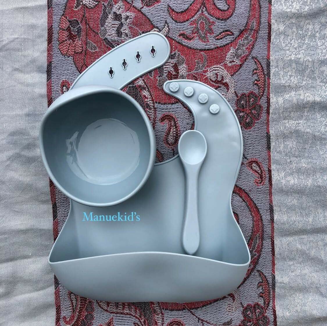 Découvrez notre set de repas en silicone pour bébés, parfait pour les premiers repas de votre petit. Comprend un bavoir pratique, un bol et une cuillère, tous conçus pour un nettoyage facile et sécuritaire. Disponible en plusieurs couleurs attrayantes.