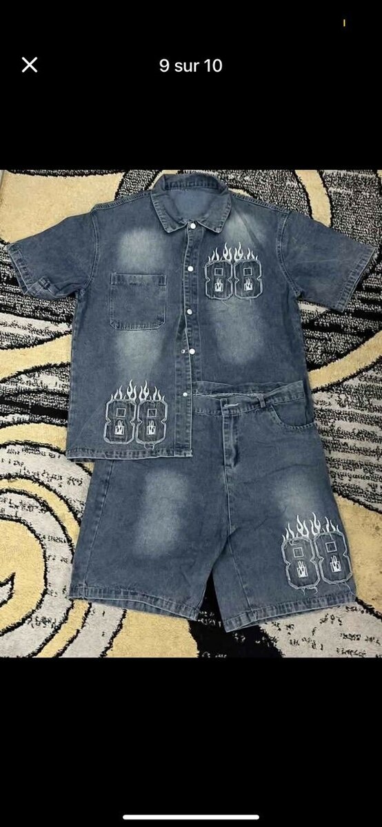 Optez pour un style estival avec ce set en jean pour homme. Composé d'une chemise à manches courtes et d'un short assorti, ce kit est idéal pour les sorties décontractées. Sa texture denim robuste assure confort et durabilité, tandis que les motifs brodés apportent une touche moderne et tendance. Parfait pour une tenue décontractée en été.