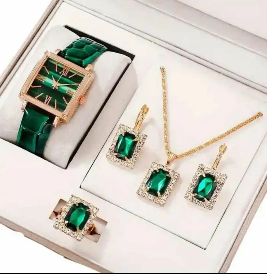 Élégant coffret avec montre et parure ornée de pierres vertes scintillantes. Parfait pour compléter une tenue chic ou pour offrir en cadeau. Idéal pour occasions spéciales.