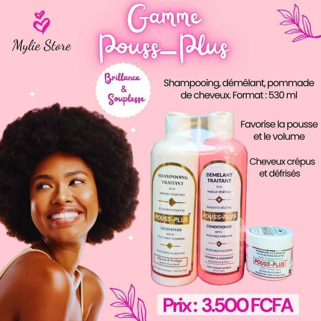 Découvrez notre gamme Pouss-Plus : shampoing, après-shampoing et pommade pour des cheveux brillants et soyeux. Idéal pour favoriser la pousse et le volume des cheveux crépus et défrisés. Format: 530 ml.