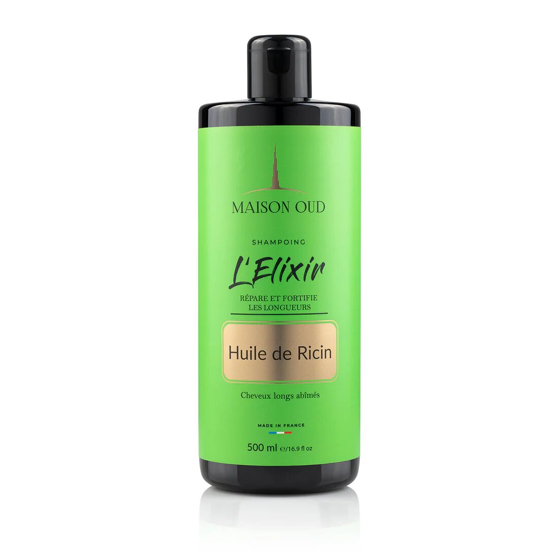 Découvrez le pouvoir régénérant du Shampoing L'Elixir par Maison Oud. Enrichi en huile de ricin, il répare et fortifie les cheveux longs et abîmés. Idéal pour une chevelure soyeuse et saine au quotidien.
