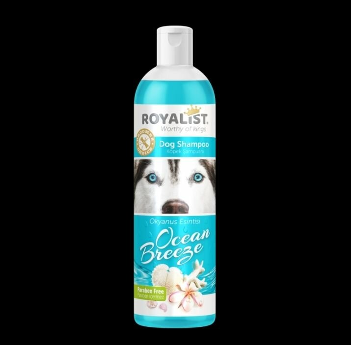 Shampooing pour chiens ROYALIST Ocean Breeze, idéal pour une fourrure saine et propre. Sans parabène, pour tous types de poils. Parfum océanique frais.