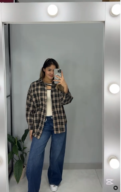 Теплая рубашка в клетку оверсайз с воланами