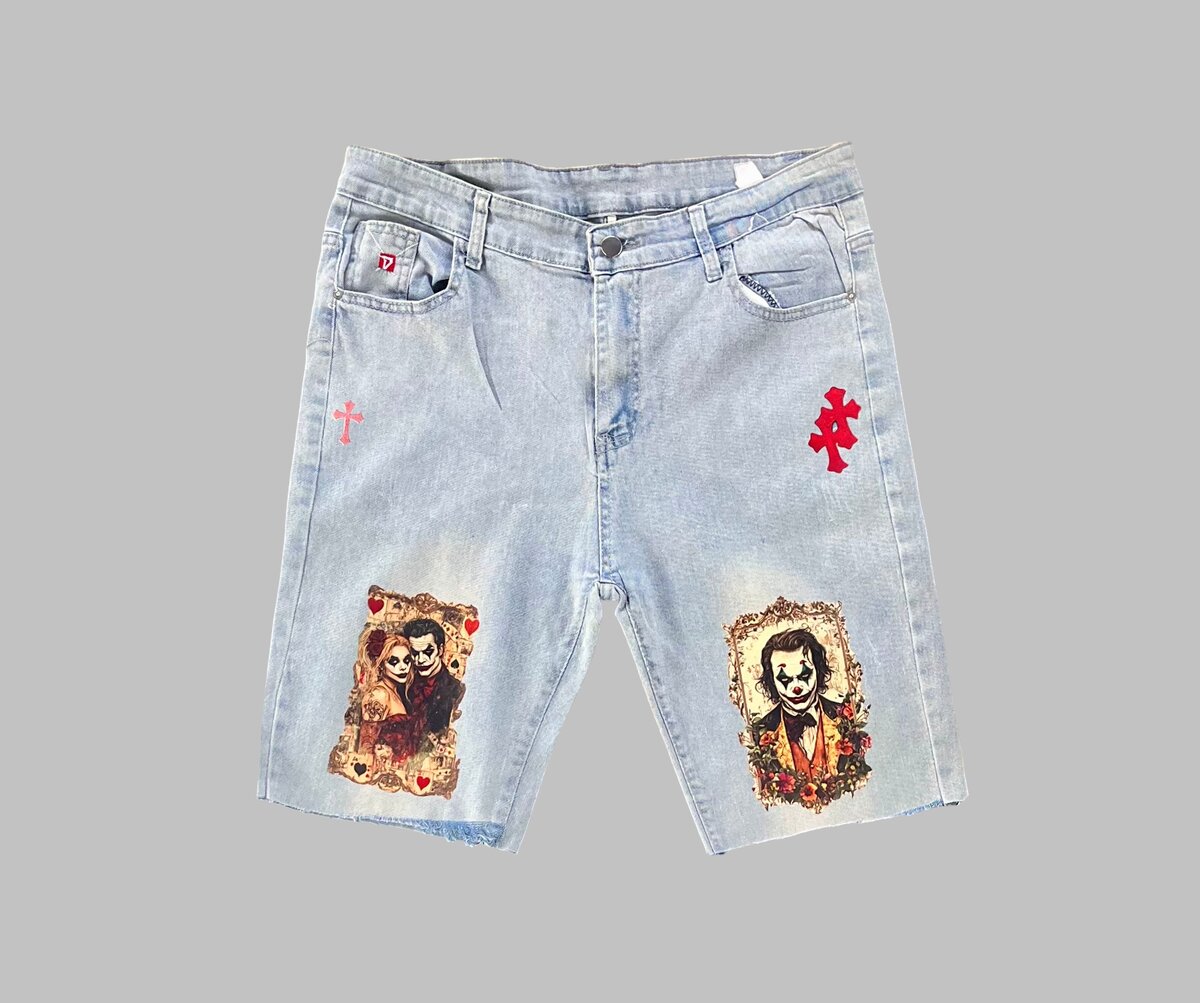 Découvrez ce short en jean unique avec imprimés artistiques et croix. Parfait pour les looks décontractés et stylés, ce short apportera une touche d'originalité à votre garde-robe estivale. Conçu pour le confort et la mode, il est idéal pour les sorties entre amis ou les festivals.