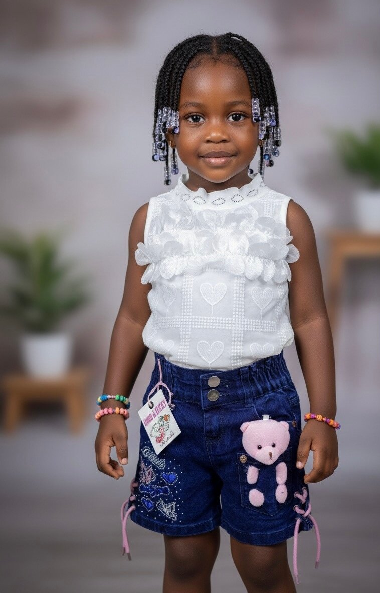 Mignon short en denim pour enfant avec un motif d'ours en peluche. Parfait pour les petites aventurières. Confortable et stylé, idéal pour toutes les occasions.