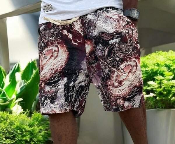 Short tendance homme avec motif camouflage multicolore et effet déchiré. Look urbain, parfait pour un style streetwear.