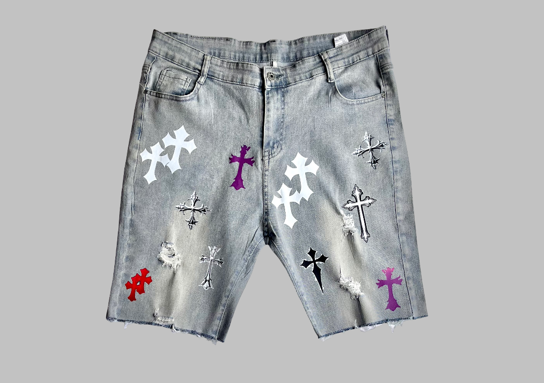 Shorts en denim gris avec motifs de croix colorés, parfaits pour un look décontracté et tendance cet été. Idéal pour les sorties et les événements décontractés, ces shorts offrent un style unique avec leurs détails déchirés. Fabriqués en coton de haute qualité pour un confort maximal.
