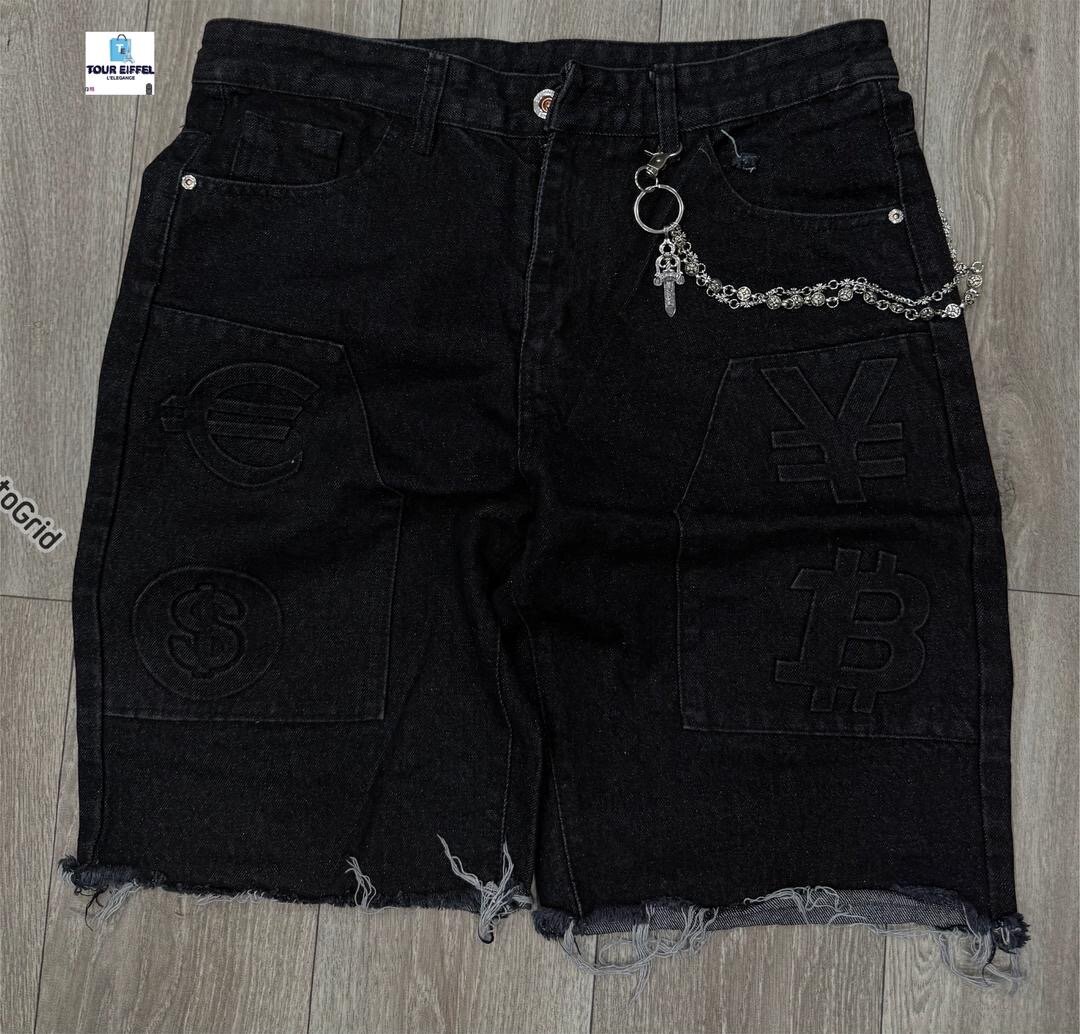 Découvrez nos shorts en jean décontractés, parfaits pour un style urbain et chic. Fabriqués avec un denim de haute qualité, ils sont ornés de motifs tendance et d'une chaîne décorative. Idéal pour les sorties en ville, ces shorts ajoutent une touche unique à votre tenue. Leur design moderne convient à tous les garde-robes.