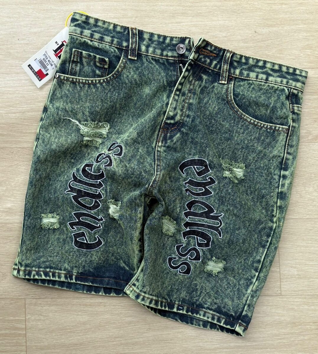 Découvrez ces shorts en jean délavé à la mode, ornés de détails déchirés et d'un design 'endless'. Parfaits pour un look décontracté et tendance.