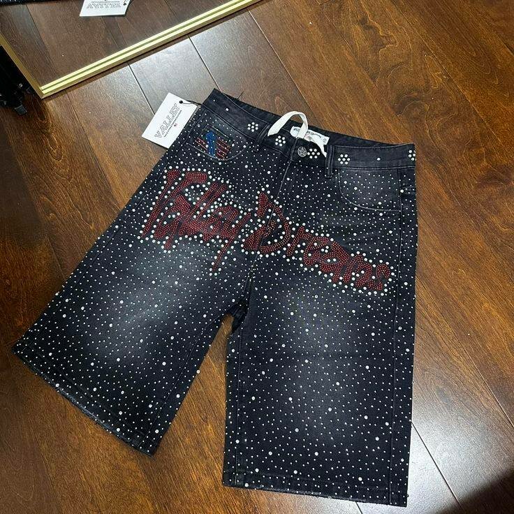 Découvrez ces shorts noirs élégants avec une touche glamour. Conçus en denim de haute qualité, ils sont embellis de strass qui ajoutent une brillance exceptionnelle. Parfaits pour des occasions spéciales ou pour ajouter une touche chic à votre tenue décontractée.