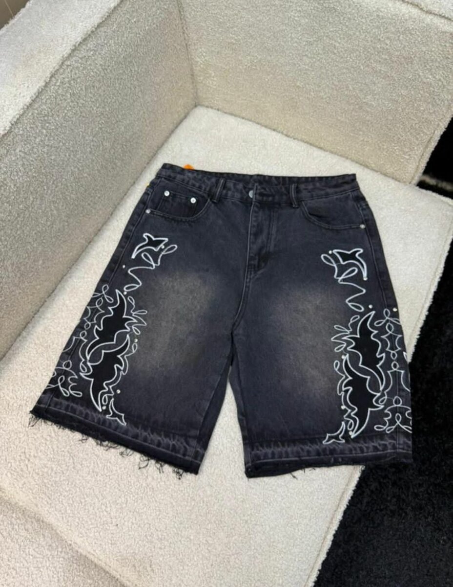 Découvrez ces shorts en jean noir avec impression graphique. Confortables et stylisés, ils sont parfaits pour un look décontracté et moderne. Idéal pour les sorties estivales ou pour un style urbain distinctif.
