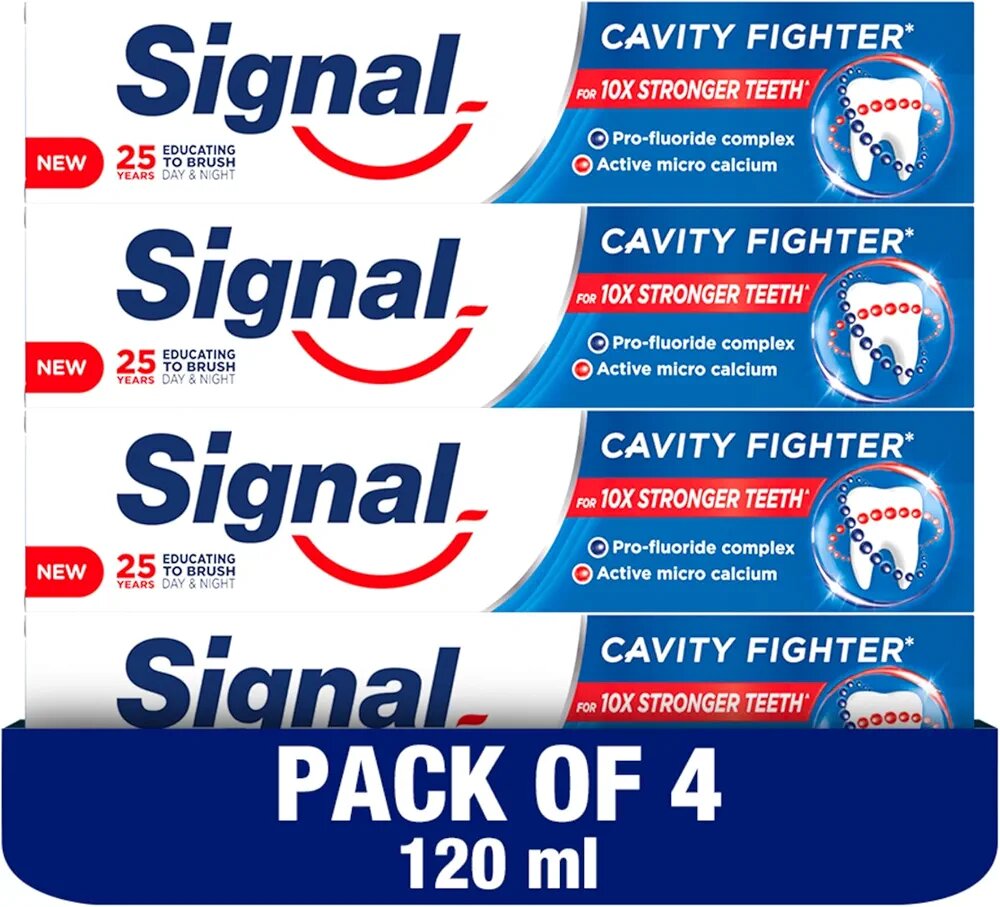 Découvrez Signal Cavity Fighter, la pâte dentifrice idéale pour protéger votre sourire. Formulée avec un complexe pro-fluoré et du micro-calcium actif, elle renforce vos dents en les rendant 10 fois plus résistantes aux caries. Parfait pour toute la famille, ce pack de 4 x 120 ml offre une protection scientifique prouvée pour des dents plus fortes et un sourire éclatant. Rejoignez notre mission pour des sourires en santé !