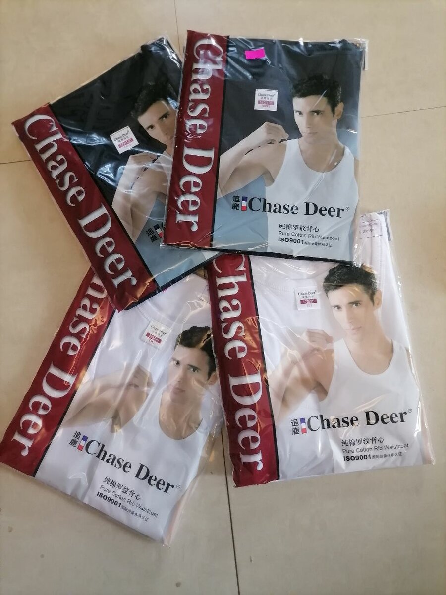 Chase Deer singlet. 100% cotton. Soft feel, comfortable, good stretch. Does not deform after washing, good moisture absorption and air permeability. XXL, XL, L & M ( extra extra large, extra large, large and medium sizes). Black and white colours available.
