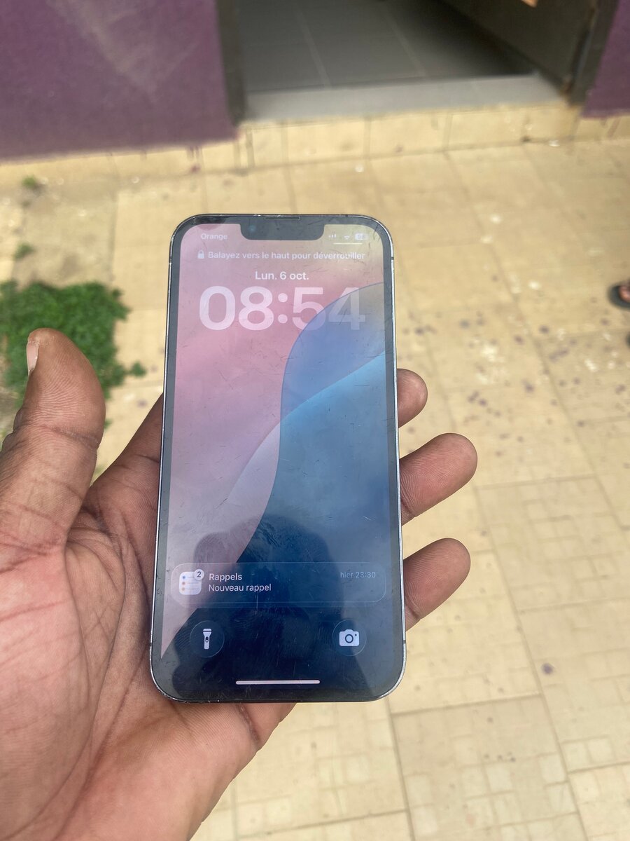 Arrière fissuré, batterie 77 %, Face ID ok