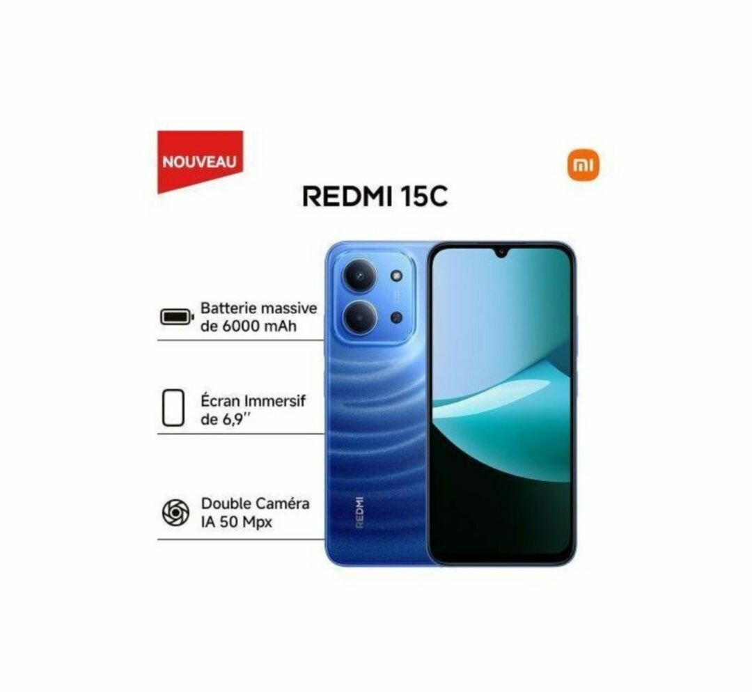 Découvrez le smartphone Redmi 15C avec une batterie massive de 6000 mAh pour une autonomie impressionnante. Profitez de son écran immersif de 6,9 pouces et de sa double caméra IA de 50 MP pour capturer chaque moment en haute qualité. Idéal pour ceux qui recherchent performance et design élégant.